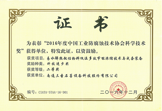 三圣石墨的“易水解熱敏性物料低溫多效節(jié)能濃縮技術(shù)與裝備”獲得中國工業(yè)防腐蝕技術(shù)協(xié)會頒發(fā)的科技進(jìn)步二等獎。此次評獎一等獎空缺,我公司獲得的獎項為石墨設(shè)備行業(yè)唯一的一個二等獎。