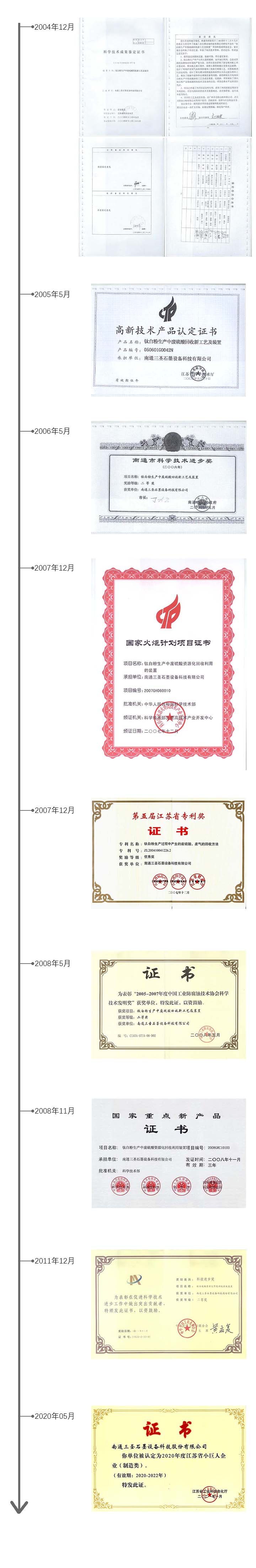 南通三圣該項(xiàng)技術(shù)先后得到了政府諸多部門(mén)的高度評(píng)價(jià)。2004年12月,“鈦白粉生產(chǎn)中廢硫酸回收新工藝及裝置”通過(guò)江蘇省科技廳組織的科技成果鑒定,鑒定意見(jiàn)指出,該項(xiàng)成果填補(bǔ)了國(guó)內(nèi)鈦白粉產(chǎn)業(yè)廢硫酸回收技術(shù)及裝備的空白,總體水平達(dá)到國(guó)際先進(jìn)。2005年5月,該項(xiàng)成果被認(rèn)定為江蘇省高新技術(shù)產(chǎn)品。2006年5月,該項(xiàng)成果榮獲南通市科技進(jìn)步二等獎(jiǎng)。2007年12月,“鈦白粉生產(chǎn)中廢硫酸資源化回收利用的裝置”被科技部列為國(guó)家火炬計(jì)劃項(xiàng)目。2007年12月,“鈦白粉生產(chǎn)過(guò)程中產(chǎn)生的廢硫酸、廢氣的回收方法”榮獲江蘇省優(yōu)秀專(zhuān)利獎(jiǎng)。2008年5月,“鈦白粉生產(chǎn)中廢硫酸回收新工藝及裝置”榮獲中國(guó)工業(yè)防腐蝕技術(shù)協(xié)會(huì)技術(shù)發(fā)明二等獎(jiǎng)。2008年11月,“鈦白粉生產(chǎn)中廢硫酸資源化回收利用裝置”被科技部、環(huán)保部、商務(wù)部、國(guó)家質(zhì)檢總局認(rèn)定為國(guó)家重點(diǎn)新產(chǎn)品。2011年12月,“鈦白廢酸資源化節(jié)能回收系統(tǒng)裝置”榮獲中華全國(guó)工商業(yè)聯(lián)合會(huì)科技進(jìn)步二等獎(jiǎng)。2020年,公司以工業(yè)廢副硫酸低能耗蒸發(fā)濃縮與資源化回收成套裝備產(chǎn)品獲得江蘇省專(zhuān)精特新小巨人企業(yè)榮譽(yù)稱(chēng)號(hào)。