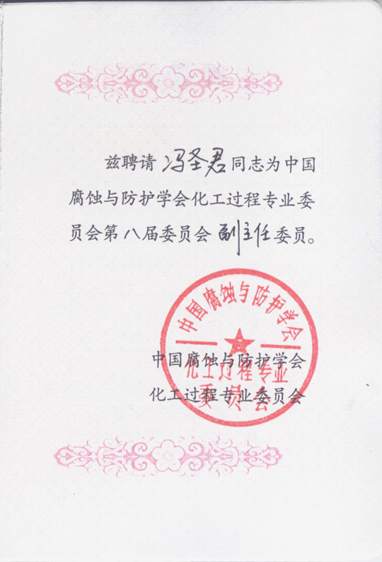 日前,公司馮圣君董事長(zhǎng)收到證書,正式出任中國(guó)腐蝕與防護(hù)學(xué)會(huì)化工過程專業(yè)委員會(huì)第八屆委員會(huì)副主任委員。