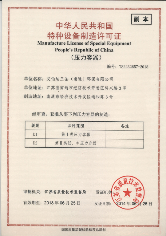 日前,艾伯納三圣(南通)環(huán)保有限公司順利取得了由江蘇省質量技術監(jiān)督局頒發(fā)的《中華人民共和國特種設備制造許可證》。獲準從事D1(第Ⅰ類壓力容器)、D2(第Ⅱ類低、中壓力容器)的制造,標志著艾伯納三圣壓力容器生產的正式開始。